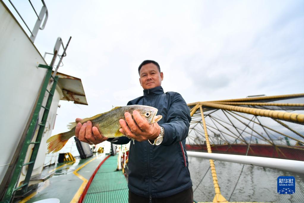 在福建福州連江縣定海灣內的“振漁1號”現代化深海養殖平臺上,福州力美水產(chǎn)科技有限公司總經(jīng)理許福安展示養殖的大黃魚(yú)(2022年11月15日攝)。新華社記者 姜克紅 攝