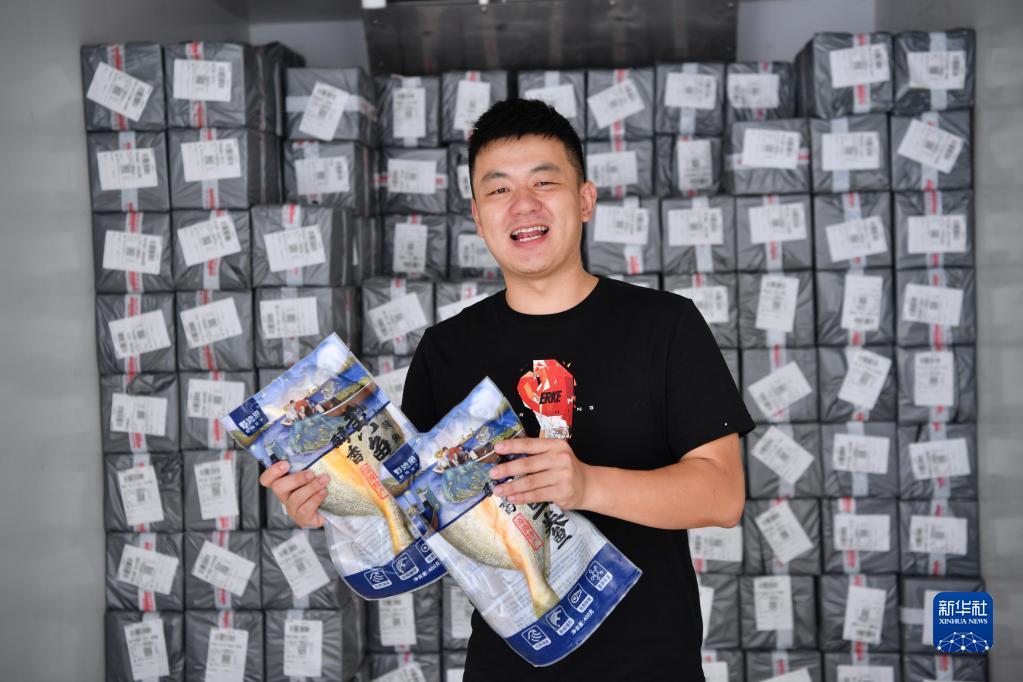 在福建寧德霞浦縣沙江鎮沙江村,張序劍在快遞車(chē)內介紹他銷(xiāo)售的大黃魚(yú)產(chǎn)品(2021年8月14日攝)。新華社記者 姜克紅 攝