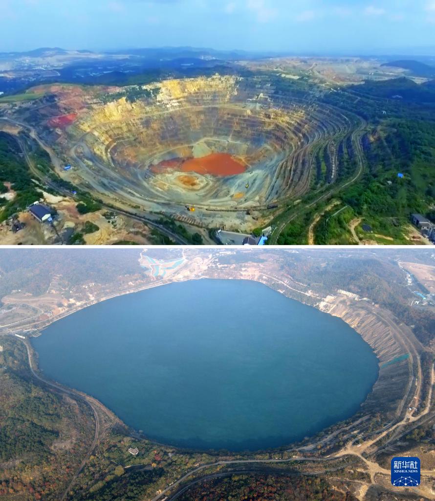 拼版照片:上圖為開(kāi)采中的安徽省馬鞍山市雨山區向山鎮凹山采場(chǎng)(資料照片),下圖為生態(tài)修復后的凹山采場(chǎng)(新華社記者劉軍喜11月8日攝,無(wú)人機照片)。新華社發(fā)