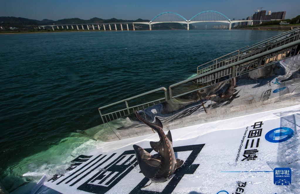 在湖北省宜昌市舉行的“2022年長(cháng)江三峽中華鱘放流活動(dòng)”現場(chǎng),中華鱘從放流通道滑入長(cháng)江(4月9日攝)。新華社發(fā)(鄭家裕 攝)