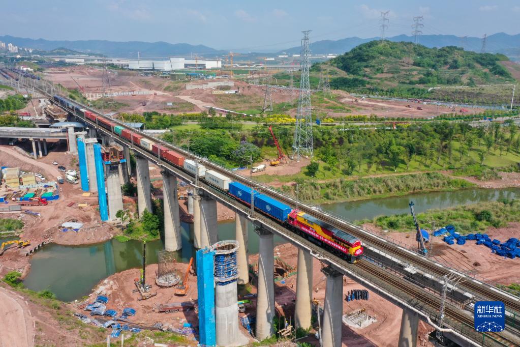 中緬新通道(重慶—臨滄—緬甸)國際鐵路班列從重慶果園港魚(yú)嘴車(chē)站順利發(fā)車(chē)(5月23日攝,無(wú)人機照片)。新華社記者 唐奕 攝