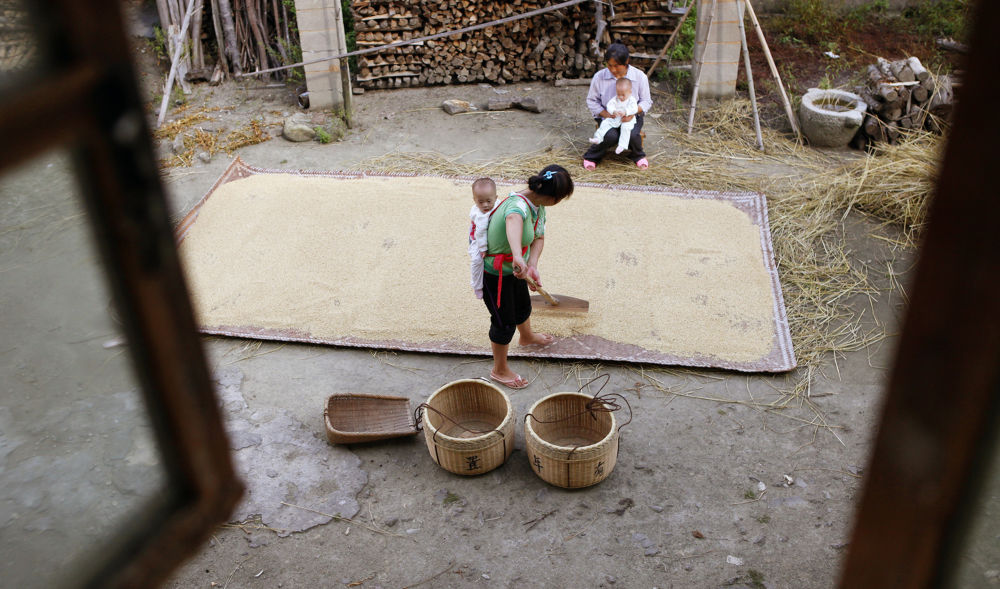 鄧丁藍(下)背著(zhù)孩子在家門(mén)口曬谷子(2011年9月14日攝)。