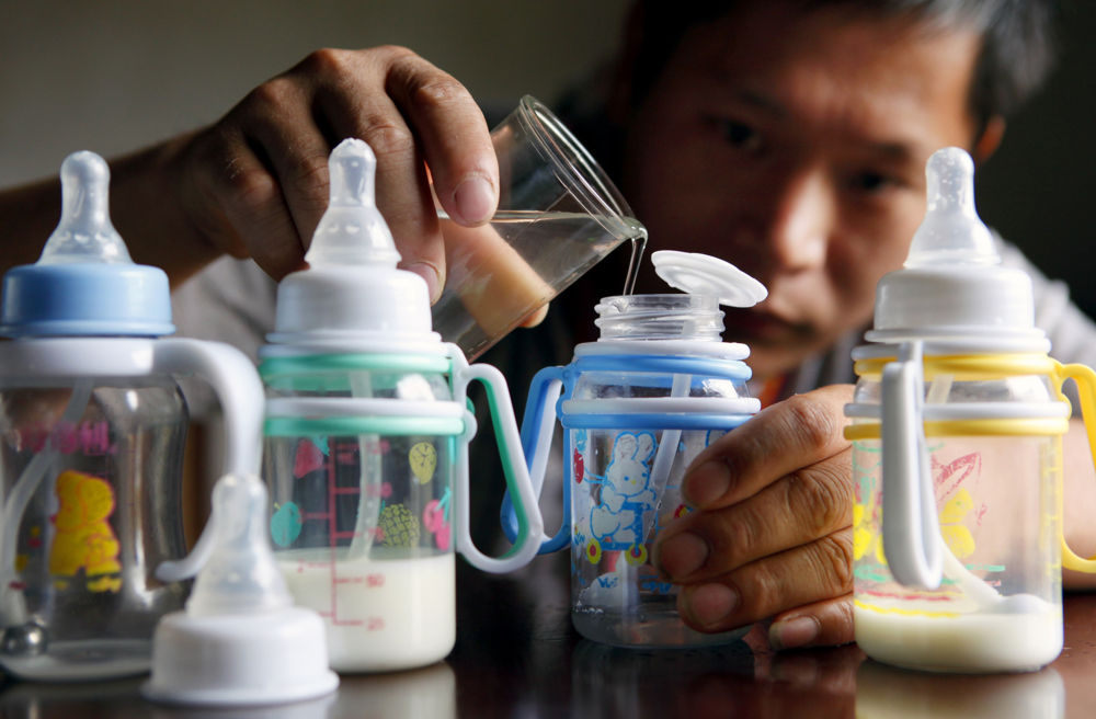 吳年有為四胞胎沖泡牛奶(2011年9月14日攝)。