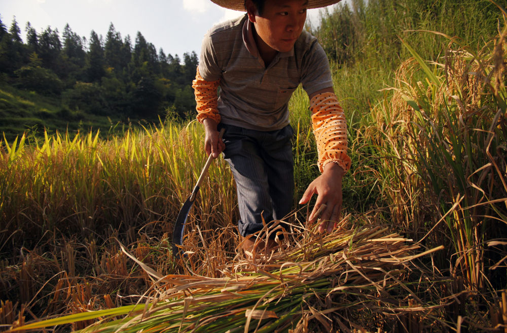 四個(gè)孩子睡午覺(jué)時(shí),吳年有抽空到田里收稻谷(2011年9月14日攝)。