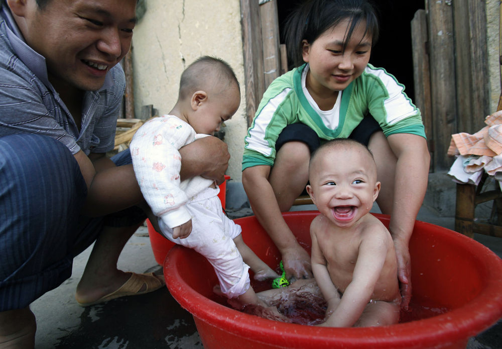 家里只有一個(gè)澡盆,小家伙們得輪著(zhù)洗。一進(jìn)澡盆她們就拍手嬉笑,這也是吳年有最開(kāi)心的時(shí)候(2011年9月14日攝)。