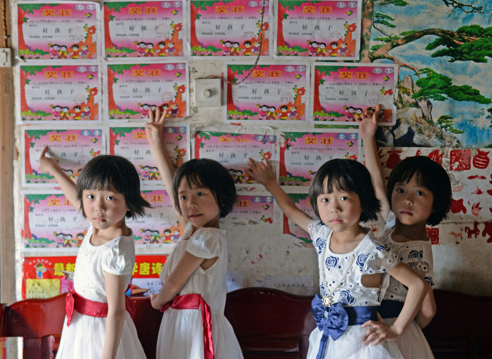十歲的四胞胎姐妹已經(jīng)不再那么瘦弱,她們都在鄉里的中心小學(xué)上學(xué)。像其他孩子一樣,她們愛(ài)吃零食,愛(ài)打鬧,愛(ài)抱怨功課多。姐妹們分在兩個(gè)班,雖然有時(shí)也會(huì )選擇不一樣的衣服去學(xué)校,但老師還是經(jīng)常叫錯她們的名字。