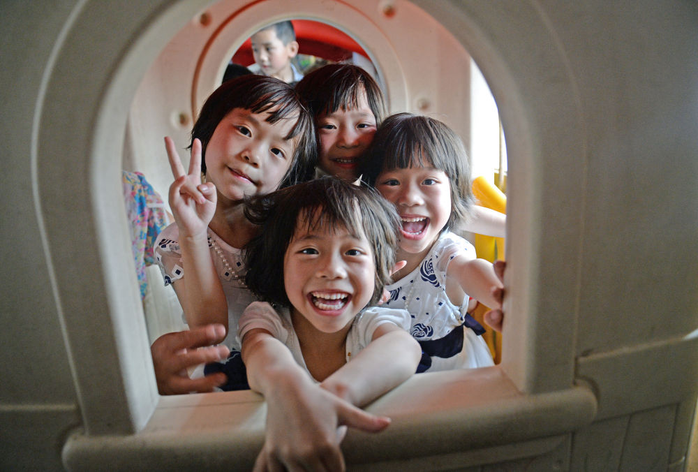 四胞胎姐妹在幼兒園里玩耍(2016年5月25日攝)。