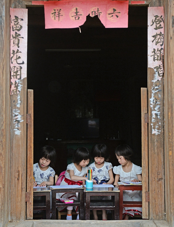 四胞胎姐妹坐在家中土坯房門(mén)口畫(huà)畫(huà)(2016年5月25日攝)。