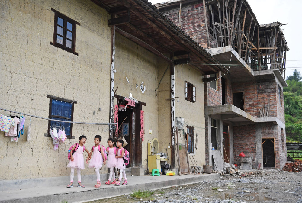 四胞胎姐妹出發(fā)去學(xué)校,身后是家中在建的三層小樓(2017年9月7日攝)。