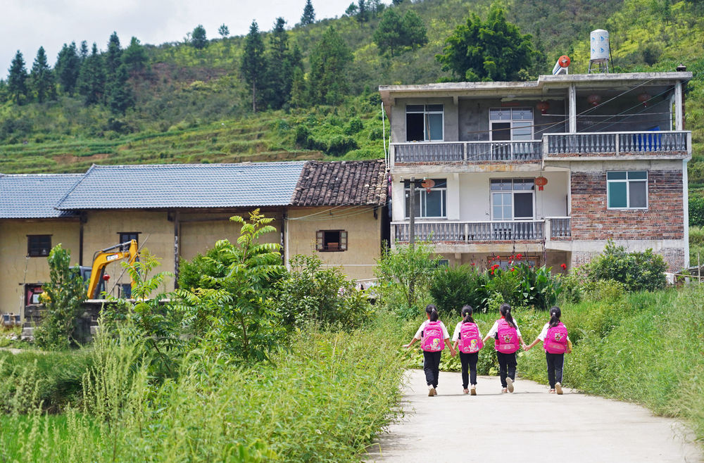 四胞胎姐妹走在放學(xué)回家的路上,遠處是家里的土坯房祖屋和新建的三層小樓(2020年9月10日攝)。