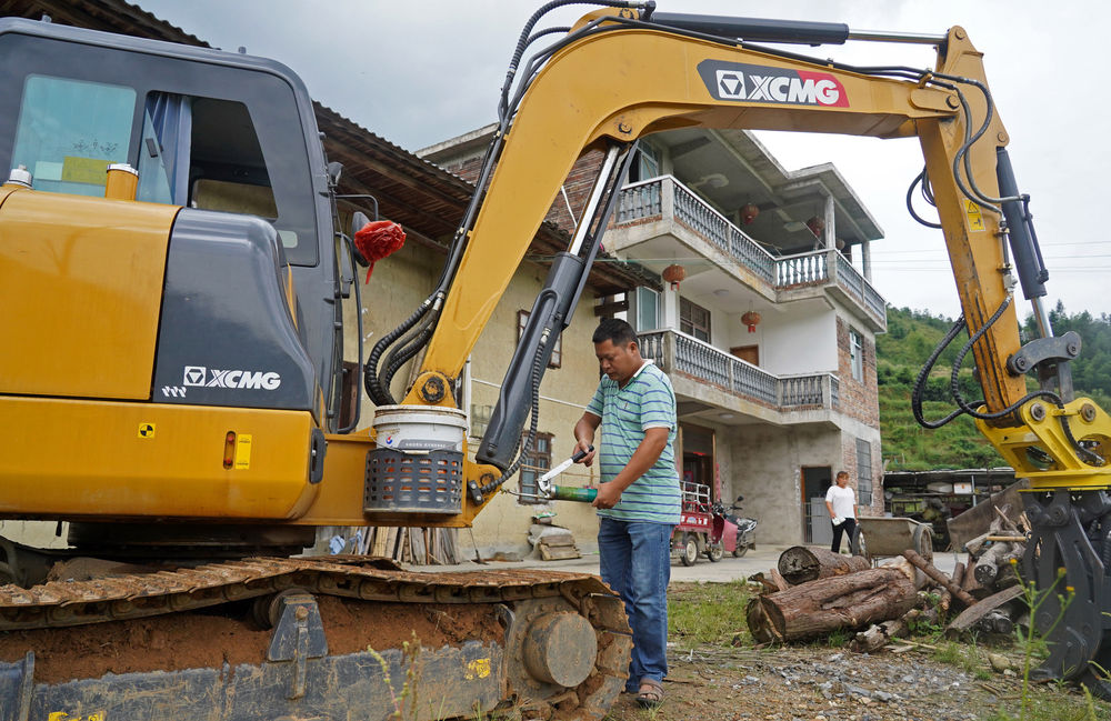 吳年有在家門(mén)前檢修挖掘機(2020年9月10日攝)。