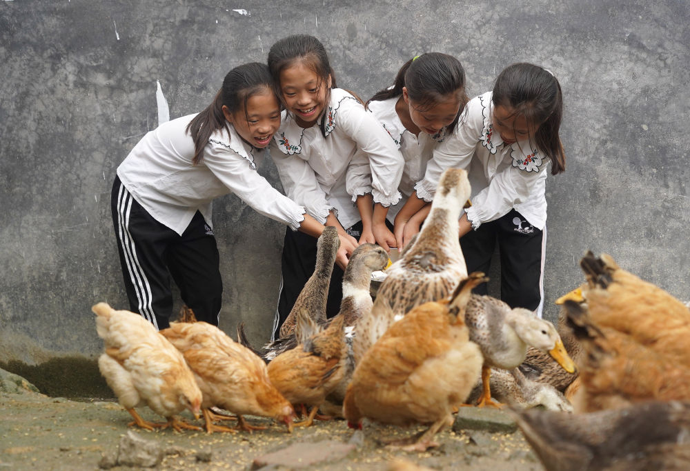 四胞胎姐妹在家里的小院旁給飼養的雞和鴨喂食(2020年9月10日攝)。