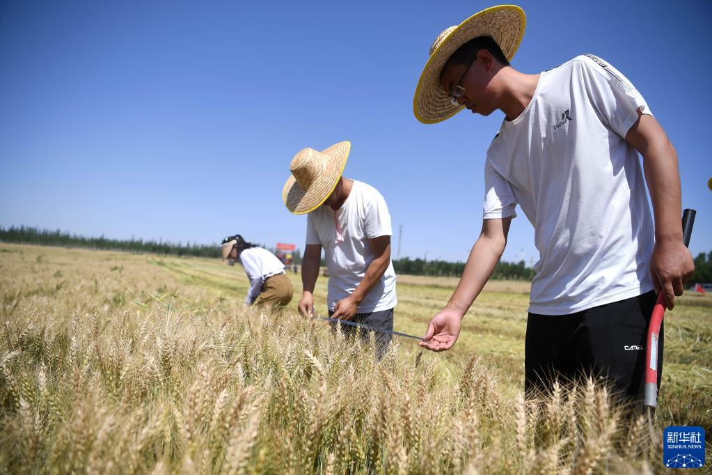 寧夏吳忠市紅寺堡區富陽(yáng)集團千畝高效節水農業(yè)示范基地,農業(yè)部門(mén)技術(shù)人員對小麥進(jìn)行測產(chǎn)(2022年7月6日攝)。新華社記者 王鵬 攝