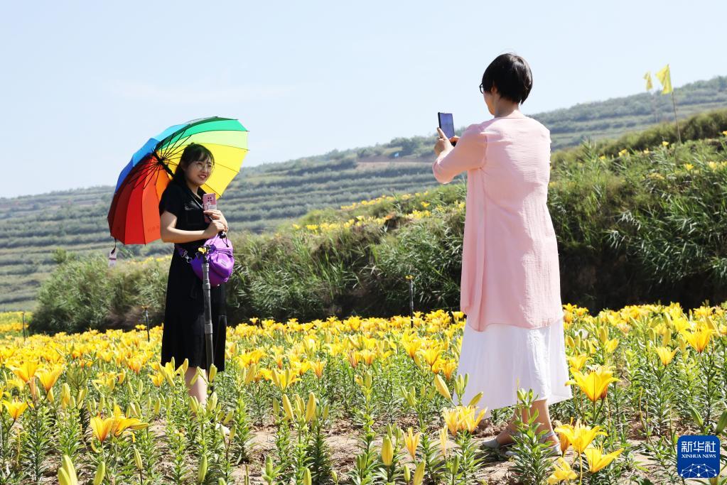 在寧夏固原市彭陽(yáng)縣金雞坪梯田公園里,兩名游客在百合花田拍照(2020年8月10日攝)。新華社記者 盧鷹 攝