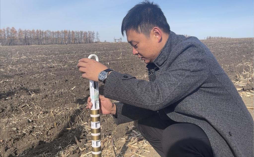 趙光農場(chǎng)有限公司農業(yè)科技服務(wù)中心主任李海成正在查看土壤墑情傳感器。(受訪(fǎng)者供圖)