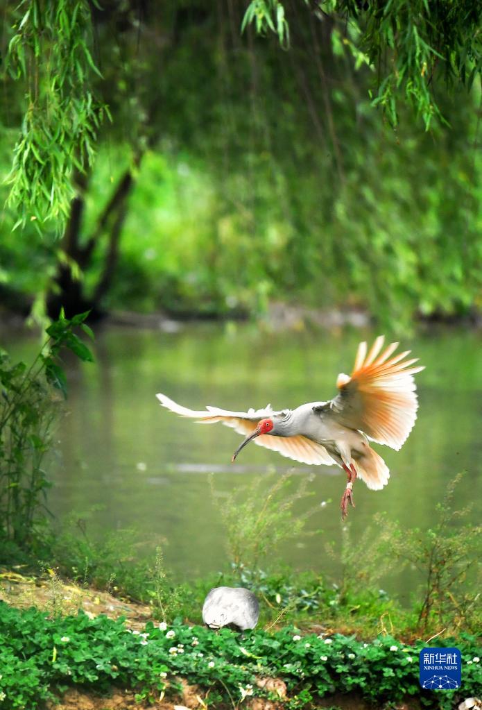 這是陜西省漢中市洋縣朱鹮生態(tài)園內的朱鹮(2021年5月13日攝)。新華社記者 劉瀟 攝