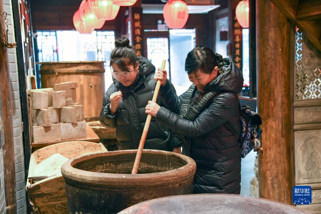 游客在平遙古城東湖老醋坊內體驗陳醋發(fā)酵打耙(2022年1月28日攝)。新華社發(fā)(梁生仁攝)