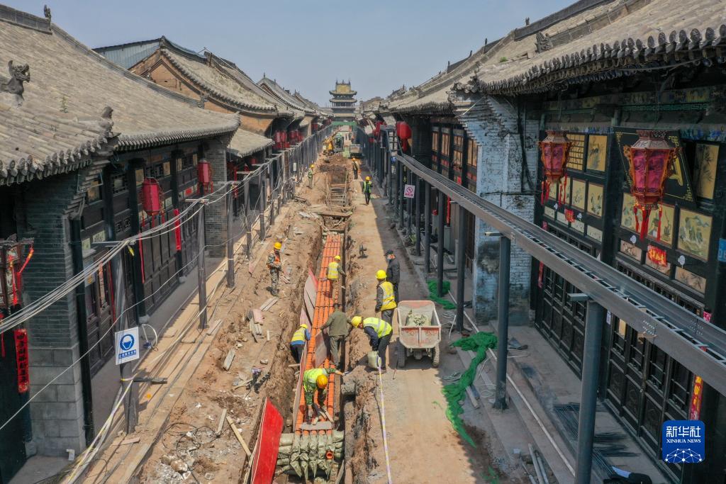 這是平遙古城內基礎設施提升改造工程施工現場(chǎng)(2022年4月16日攝)。新華社發(fā)(梁生仁攝)