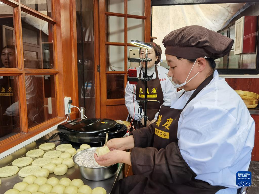 在平遙古城慶義泉爐食鋪內,工人們忙著(zhù)打月餅、直播賣(mài)貨(2022年1月25日攝)。新華社記者王學(xué)濤攝