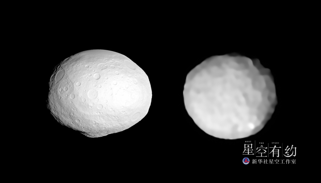 美國宇航局噴氣推進(jìn)實(shí)驗室與亞利桑那大學(xué)的科學(xué)團隊基于現有觀(guān)測數據制作的智神星模型圖(左圖);歐洲南方天文臺拍攝的智神星(右圖)。