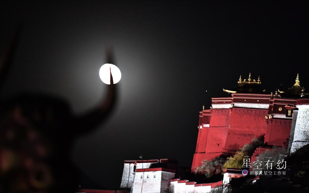 這是2022年11月11日晚在西藏拉薩市布達拉宮附近拍攝的火星合月。(新華社記者覺(jué)果 攝)