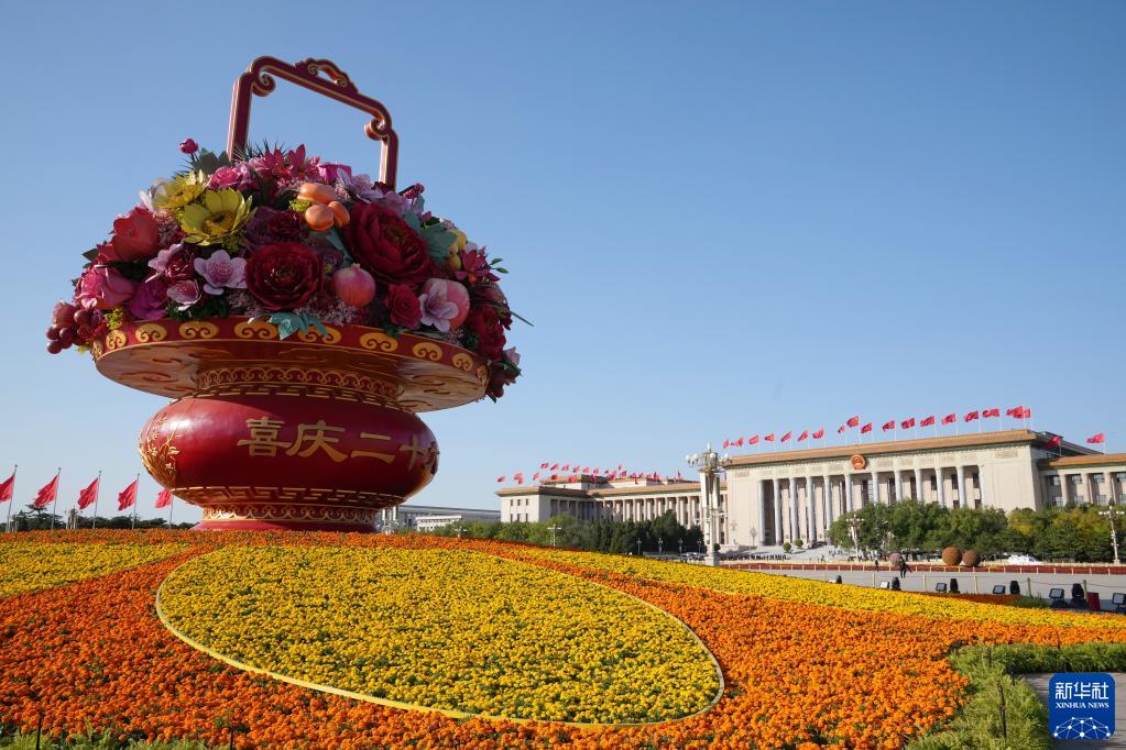 這是2022年10月16日在天安門(mén)廣場(chǎng)拍攝的“祝福祖國”巨型花果籃。中國共產(chǎn)黨第二十次全國代表大會(huì )于10月16日至22日在北京舉行。新華社記者 王毓國 攝