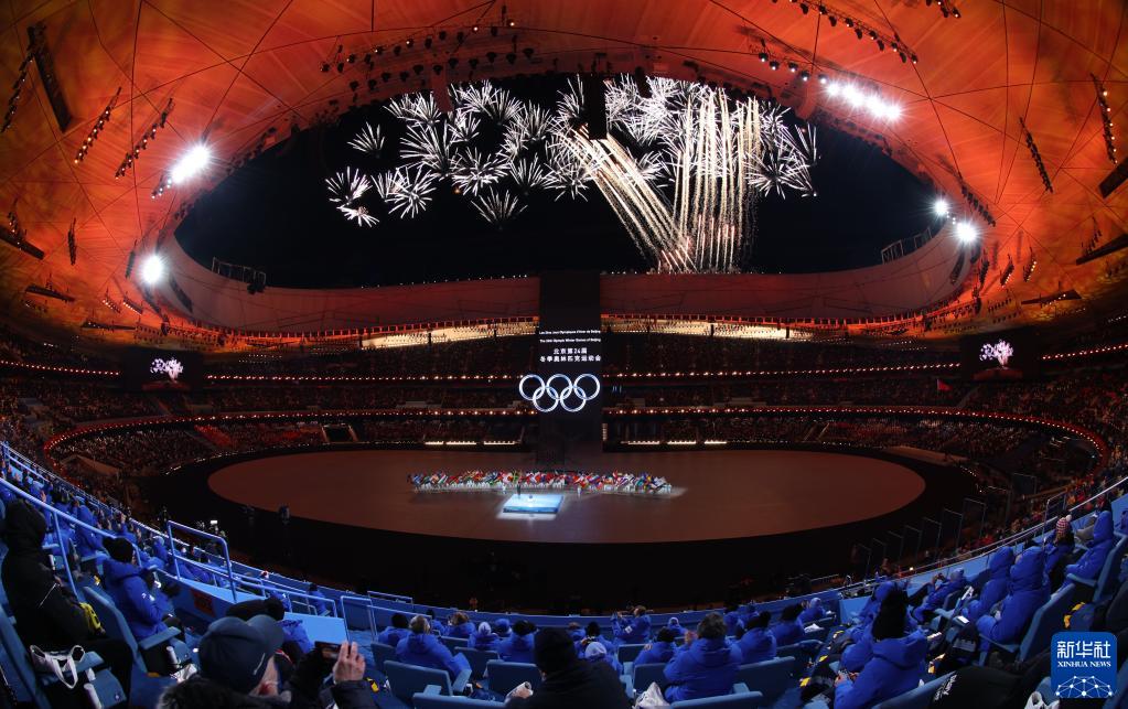 2022年2月4日晚,第二十四屆冬季奧林匹克運動(dòng)會(huì )開(kāi)幕式在北京國家體育場(chǎng)舉行。這是開(kāi)幕式上的焰火表演。新華社記者 徐子鑒 攝