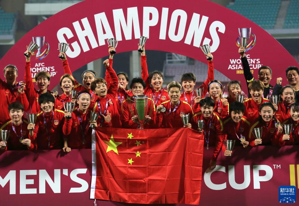 這是2022年2月6日,中國隊在2022女足亞洲杯頒獎儀式上慶祝。新華社發(fā)(賈韋德·達爾 攝)