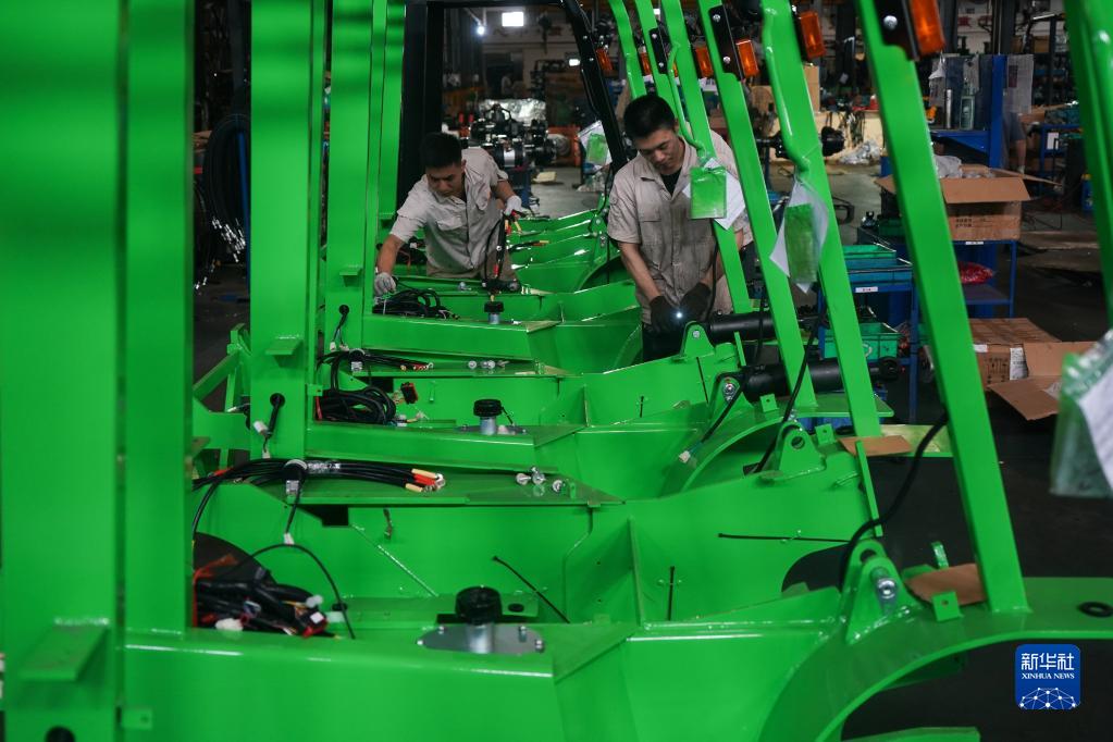 在位于江蘇靖江的江蘇中力叉車(chē)有限公司,工人在生產(chǎn)“油改電”叉車(chē)(2021年6月12日攝)。新華社記者 季春鵬 攝