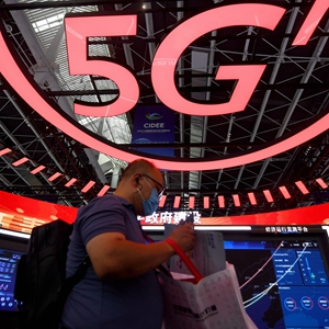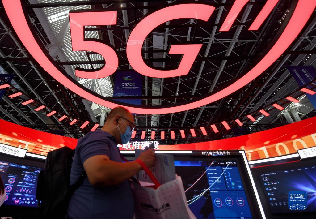 在河北省石家莊市舉行的2021中國國際數字經(jīng)濟博覽會(huì )上,參觀(guān)者走過(guò)5G智慧展區(2021年9月6日攝)。新華社記者 王曉 攝