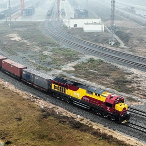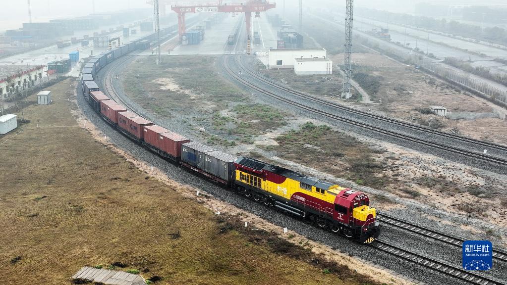 2022年1月15日,廣西新年首趟西部陸海新通道年貨班列從欽州港東站駛出(無(wú)人機照片)。新華社記者 張愛(ài)林 攝