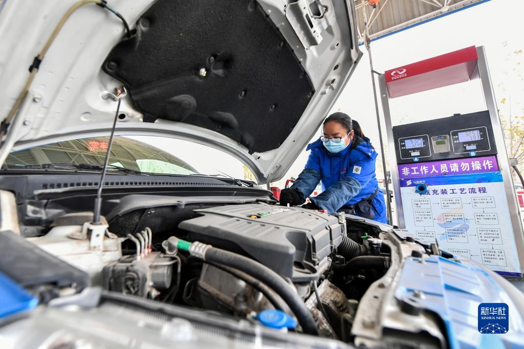 山西省晉城市澤北加氣站工作人員在為汽車(chē)加煤層氣(2020年12月9日攝)。新華社記者 曹陽(yáng) 攝