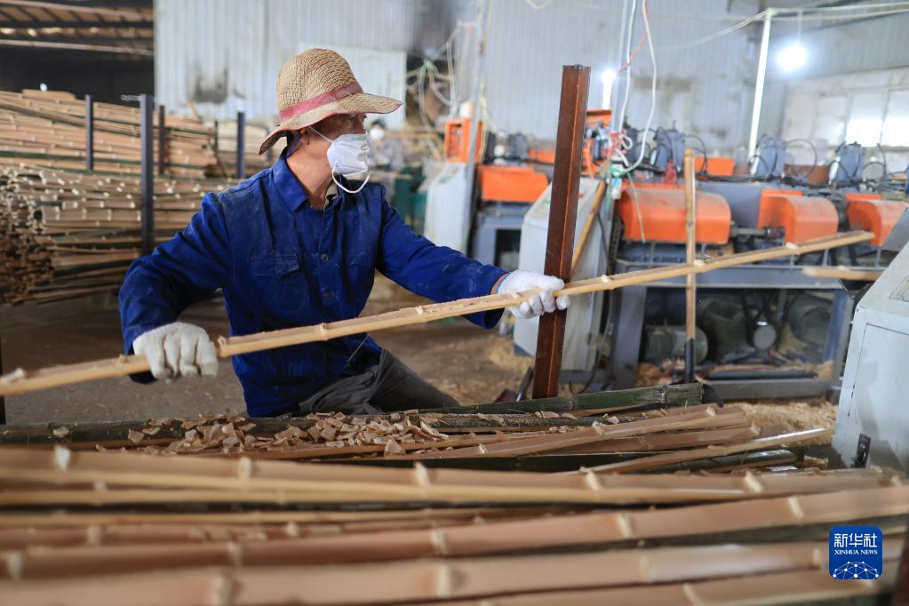 2022年11月30日,工人在貴州新錦竹木制品有限公司內生產(chǎn)竹制品。新華社記者 劉續 攝