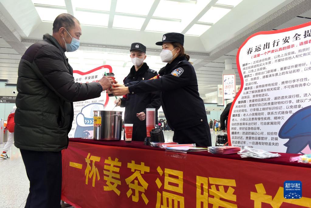 1月7日,在安徽合肥南站內,合肥鐵路公安處民警張婷(右)、王子棋(中)給一名旅客送上免費姜茶。新華社記者 郭晨 攝