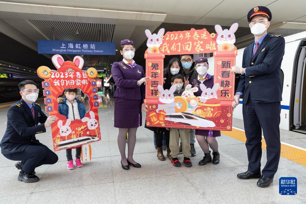 1月7日,旅客和乘務(wù)人員在上海虹橋站站臺的兔年展板前留影。新華社記者 王翔 攝