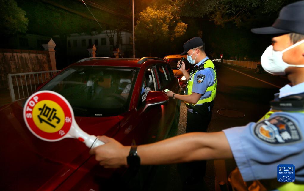 上海市公安局閔行分局梅隴派出所民警在夏夜治安巡查宣防集中統一行動(dòng)中檢查司機證件(2022年7月23日攝)。新華社記者 凡軍 攝