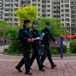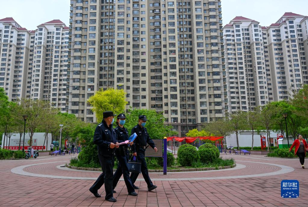 天津市公安局津南分局中鐵派出所的社區民警呂詩(shī)情(中)與民警王洪心(左)、輔警李兆輝在林景家園內巡邏(2022年4月28日攝)。新華社記者 孫凡越 攝