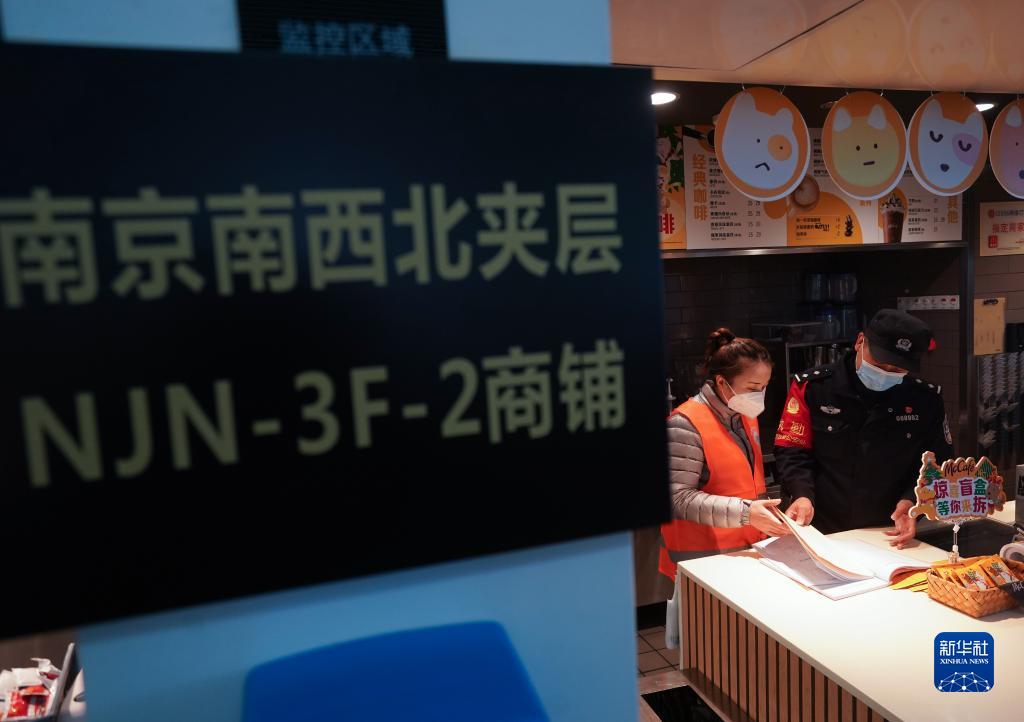 南京鐵路公安處南京南站派出所民警和志愿者一起在南京南站一家商戶(hù)檢查防火巡查記錄(2021年11月25日攝)。新華社記者 季春鵬 攝