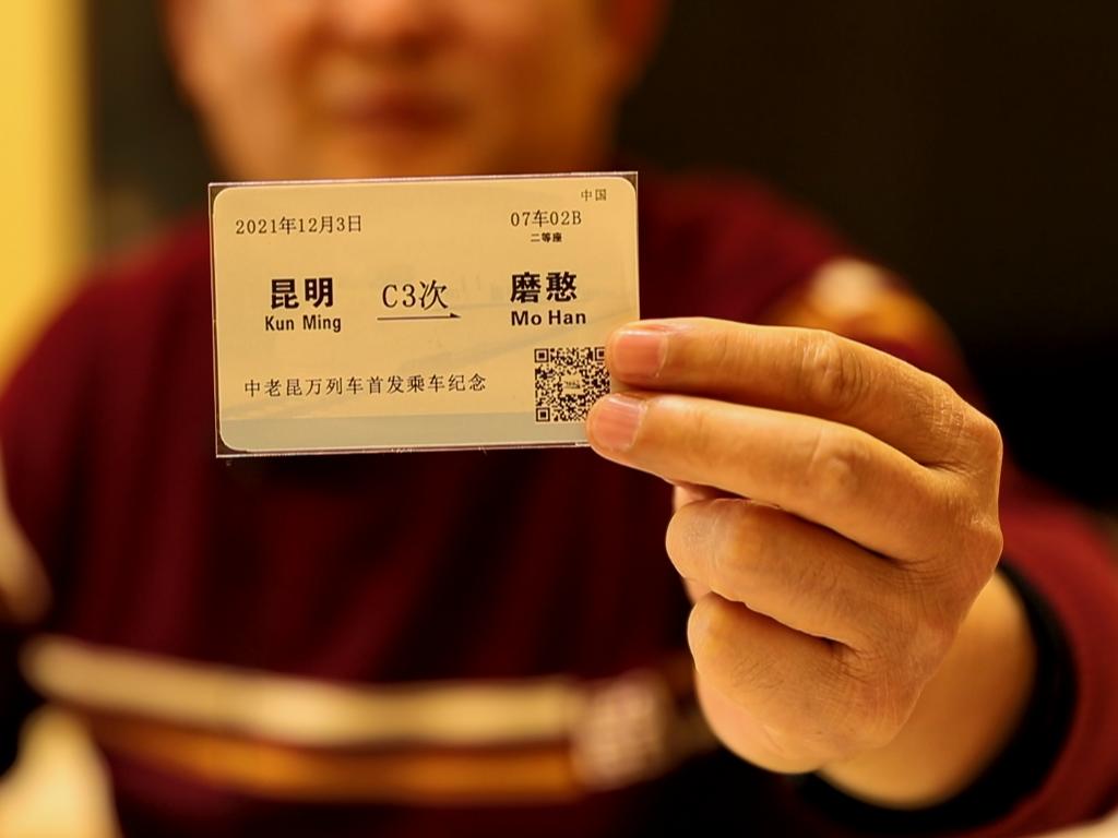 孫昆育手持中老鐵路首發(fā)列車(chē)紀念票。新華社記者王安浩維 攝