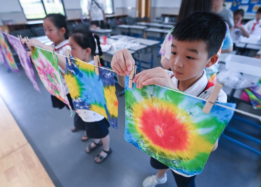 2022年8月10日,湖州市吳興實(shí)驗小學(xué)的學(xué)生把做好的扎染作品掛在教室里。新華社記者 徐昱 攝