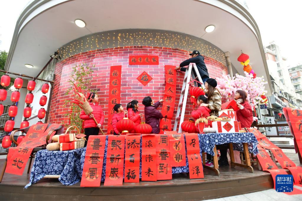 1月21日,在浙江省建德市新安江街道健安社區,人們在社區大門(mén)口貼春聯(lián)、掛燈籠。新華社發(fā)(寧文武 攝)