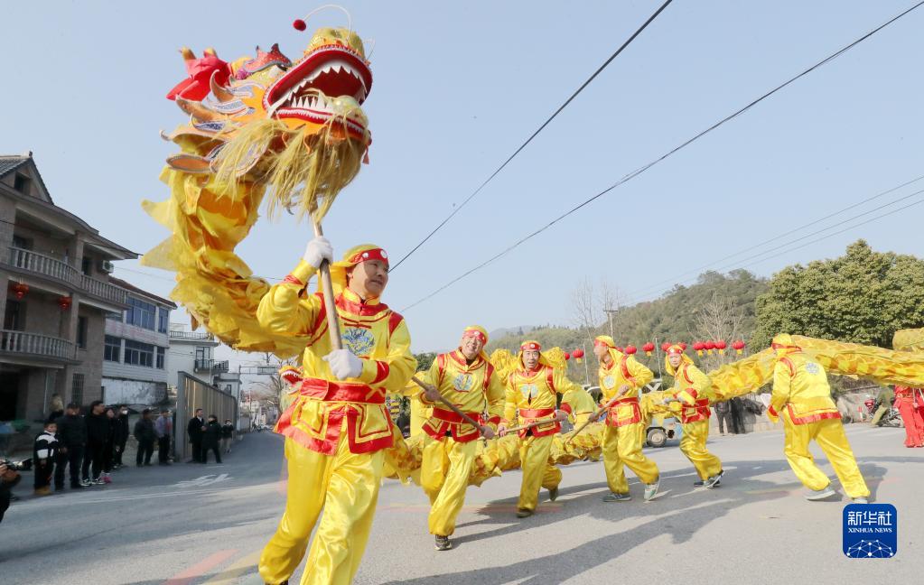 浙江湖州市德清縣莫干山鎮的村民在表演舞龍(1月19日攝)。新華社發(fā)(謝尚國 攝)
