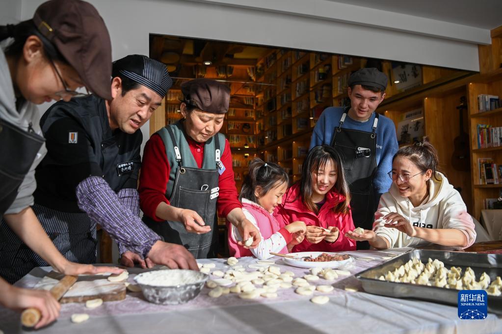 在位于新疆烏魯木齊縣板房溝鄉的樂(lè )野民宿,來(lái)自廣州的游客柳佳佳(右三)一家和民宿工作人員一起包餃子(1月20日攝)。新華社記者 丁磊 攝