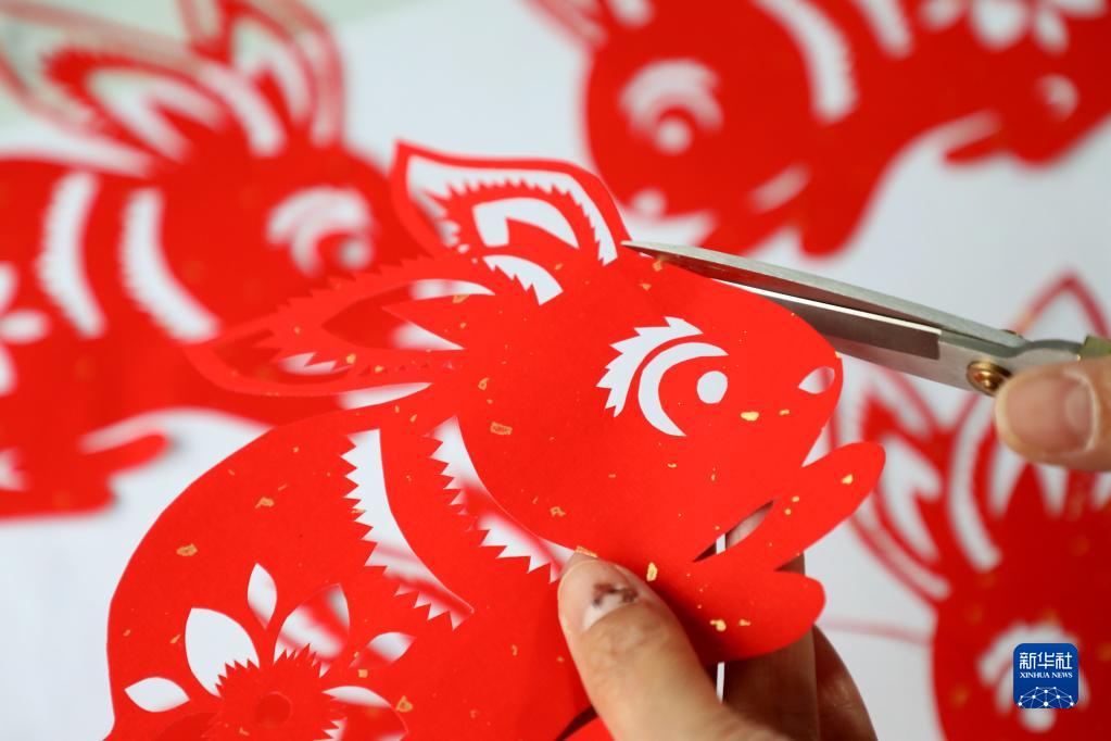 山東省濱州市惠民縣李莊鎮民間藝人在創(chuàng )作生肖兔剪紙作品(1月13日攝)。新華社發(fā)(初寶瑞 攝)