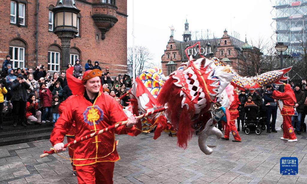 1月21日,人們在丹麥首都哥本哈根市政廣場(chǎng)觀(guān)看舞龍表演。新華社記者 林晶 攝