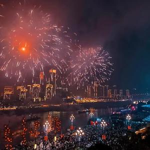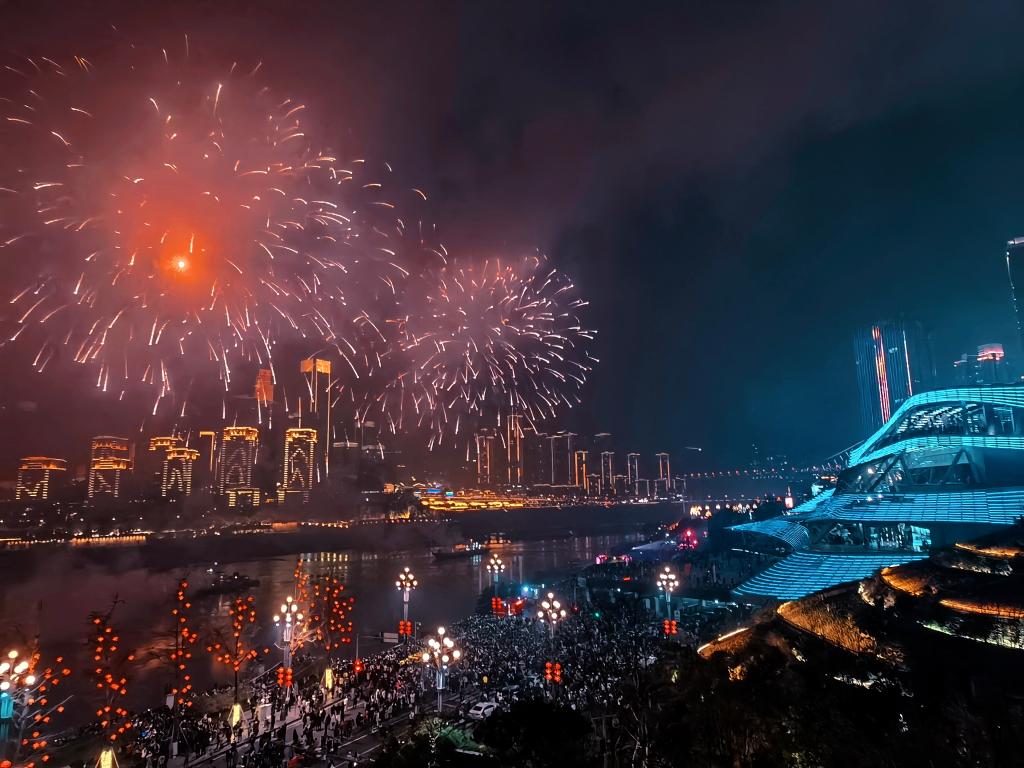除夕夜,游客市民在重慶南濱路觀(guān)賞光影無(wú)人機焰火表演。重慶市南岸區文旅委供圖
