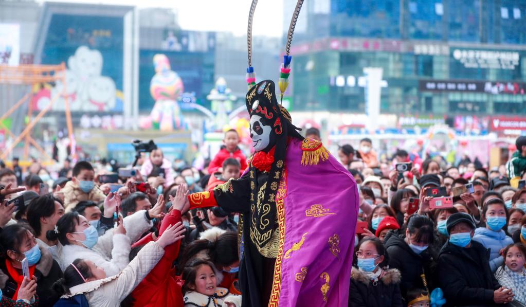 春節期間,市民在四川省瀘州市江陽(yáng)區華陽(yáng)街道世紀城文化廣場(chǎng)觀(guān)看川劇絕活“變臉”表演。新華社發(fā)