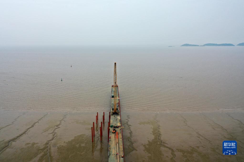 工程人員在通蘇嘉甬高鐵杭州灣跨海鐵路大橋施工現場(chǎng)鋪設棧橋,為后期工程做準備(2023年2月1日攝,無(wú)人機照片)。2022年11月30日開(kāi)工建設的通蘇嘉甬高鐵杭州灣跨海鐵路大橋全程跨海,總長(cháng)約29.2公里,為設計時(shí)速350公里的雙線(xiàn)高速鐵路橋,是目前世界上在建長(cháng)度最長(cháng)、建設標準最高的高速鐵路跨海大橋。新華社記者 黃宗治 攝
