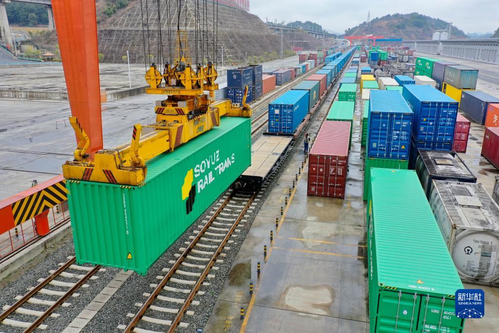 一列中歐班列在貴陽(yáng)國際陸港都拉營(yíng)站裝載集裝箱(2月9日攝,無(wú)人機照片)。新華社記者 劉續 攝