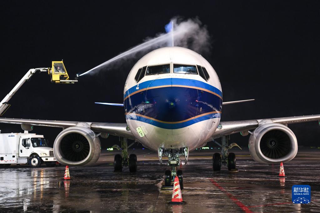 南方航空的機務(wù)人員在貴陽(yáng)龍洞堡國際機場(chǎng)進(jìn)行除防冰作業(yè)(1月17日攝)。新華社記者 楊文斌 攝